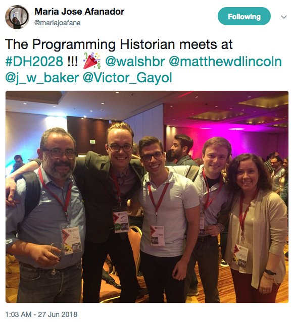 PH Blog The Programming Historian blog is our space to share news about the project, ideas for how you might use technology in your work, and exciting examples of the Programming Historian applied in the real world. Subscribe to the RSS feed for new blog posts. July 9, 2018 The Programming Historian in DH2018 Maria José Afanador-Llach and James Baker Members of the Programming Historian project team at DH2018 June 3, 2018 The Seven More Lessons No One's Yet Written (but need writing) Adam Crymble The Programming Historian Needs YOU...to help historians digitally analyse! May 24, 2018 Anna-Maria Sichani joins Project Team Antonio Rojas Castro Anna-Maria Sichani has joined the Programming Historian May 22, 2018 Uses of the Programming Historian Adam Crymble If you’re looking for inspiration into how you can use the Programming Historian in your work, look no further. We’ve put together a list of some of the examples we’ve come across over the years. We’re sure it’s no where near complete, but it’s great to see the hard work of our authors, reviewers, and team translating into real impact in a range of settings. April 16, 2018 The Programming Historian 2018 Community Survey Anandi Silva Knuppel To participate in Programming Historian 2018 Community Survey, follow this link to a Google Form: https://goo.gl/forms/2M8AbAiwgmGrD7MI3. The survey should take only a few minutes to complete and will close July 15, 2018. April 12, 2018 Convocatoria para taller de Escritura en Humanidades Digitales para América Latina Maria José Afanador-Llach and Adam Crymble The Programming Historian en español invita a la comunidad académica hispanohablante a participar en el taller Escritura en Humanidades Digitales para América Latina que se llevará a cabo en la Universidad de los Andes (Bogotá, Colombia) del 1 al 3 de agosto de 2018. El objetivo del taller es reunir a un grupo diverso de investigadores en distintas áreas de las humanidades para escribir tutoriales sobre metodologías en humanidades digitales, abordando específicamente necesidades de investigación en América Latina y el mundo hispano. Durante el taller se facilitará la producción de los primeros tutoriales originales en español para ser compartidos con una audiencia global. April 6, 2018 Convocatoria para lecciones en español en The Programming Historian Jennifer Isasi and José Antonio Motilla The Programming Historian en español ha establecido una comunidad diversa en la que publicamos tutoriales revisados por pares dirigidos a humanistas que quieran aprender a utilizar herramientas digitales para sus propósitos de investigación y/o enseñanza. Hasta hoy, el equipo en español se ha centrado en la traducción de lecciones escritas en inglés, adaptándolas en la medida de lo posible a su uso en español. ← 13 / 19 →